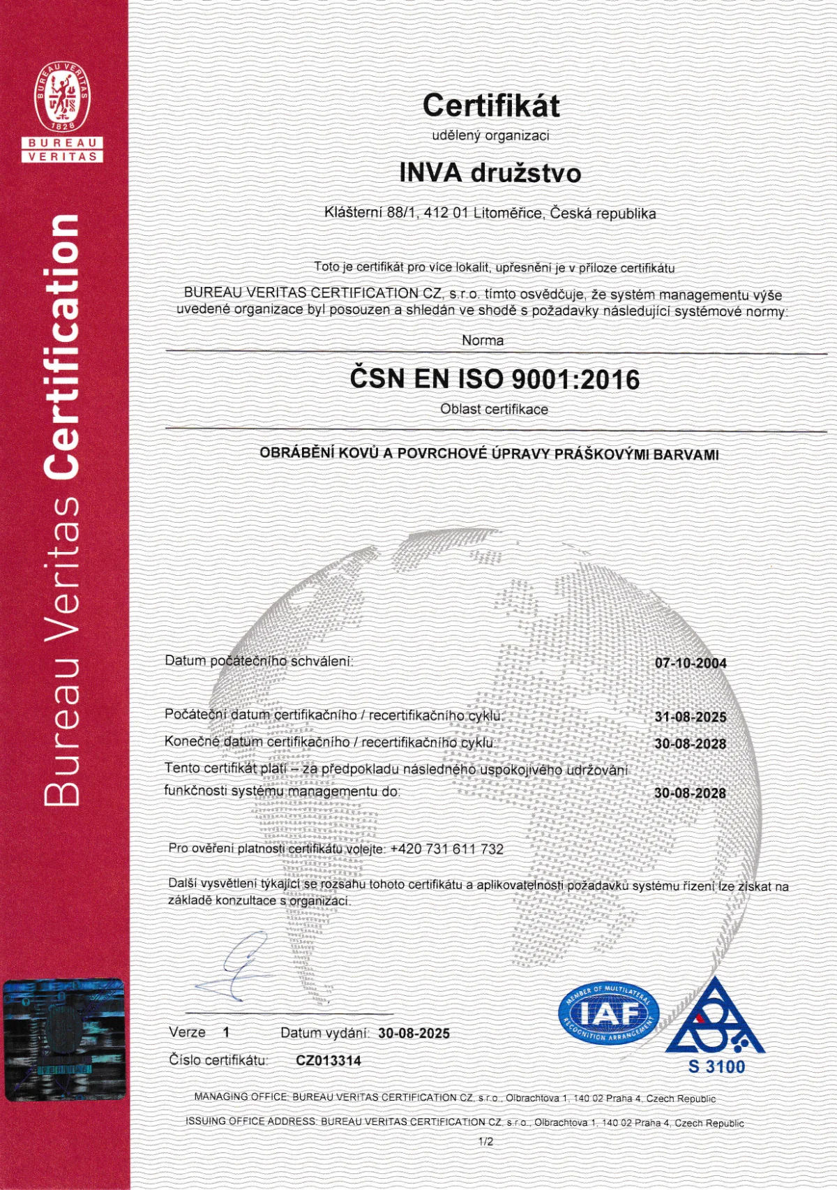 Družstvo poprvé získalo v roce 2001 certifikát podle ISO 9001:2000. V roce 2019 jsme získali certifikát podle ČSN EN ISO 9001:2016. Všechny certifikace provedla BUREAU VERITAS.
